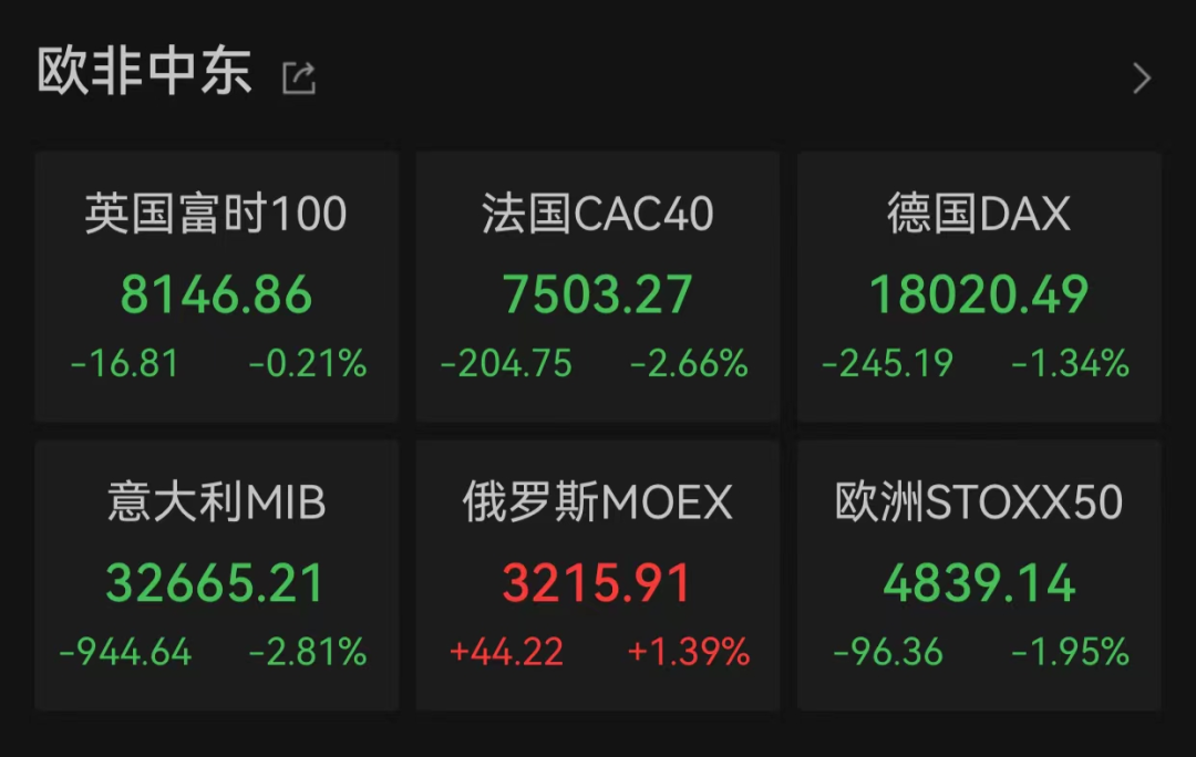 当地时间6月14日,欧洲股市继续全线下跌,截至收盘,英国富时100指数下跌0.21%,法国CAC40指数下跌2.66%,德国DAX指数下跌1.34%,意大利富时MIB指数下跌2.81%,欧洲STOXX50指数下跌1.95%。